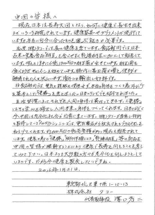 新的一年,78岁的沟口先生亲笔写下致中国客户的新年寄语,感谢广大消费者对产品和公司的厚爱,希望广大消费者今后继续支持公司品,公司也将一如既往的以优秀的产品、优质的服务和严谨的作风服务广大中国消费者。